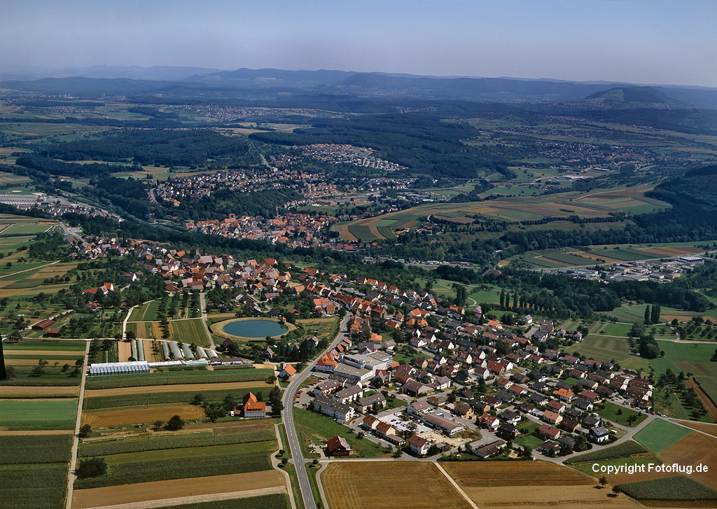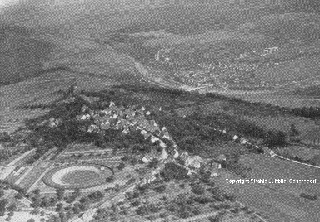 Blickrichtung Süd-Ost. Im Hintergrund das Neckartal mit Neckartenzlingen. Copyright Strähle Luftbild, Schorndorf, Nr. 6264, Aufnahmedatum 26.09.1928. |