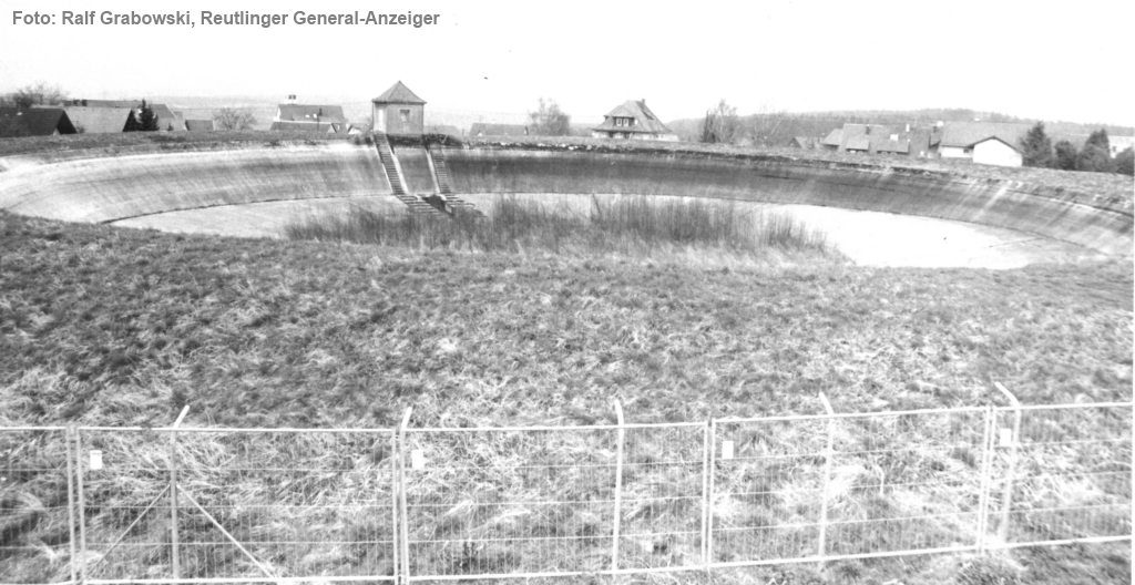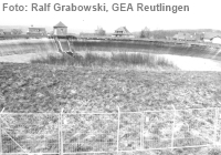 Der Grasbewuchs der Ablagerungen in der Beckenmitte hatte zum Zeitpunkt der Aufnahme (Frühjahr 1997) stark zugenommen. Foto: Ralf Grabowski, Reutlinger General-Anzeiger. |