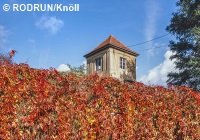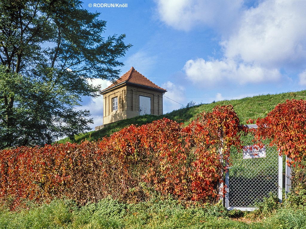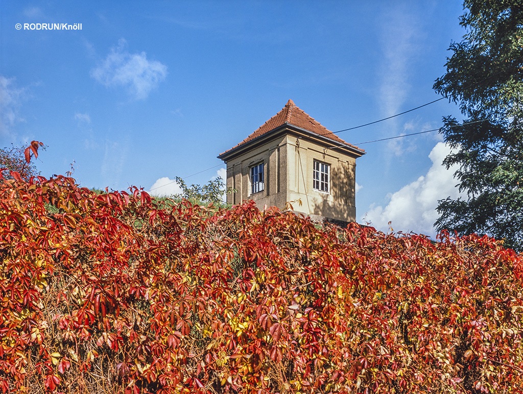 Schieberhäuschen mit vom Wilden Wein bewachsenen Zaun im Vordergrund. Aufnahmedatum 10.10.1989. Copyright RODRUN/Knöll |